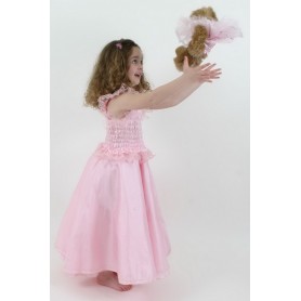 This delightful Princess outfit has a stunning skirt , which is a FULL circle of layers of satin and net topped with pretty pale pink organza .It is a twopiece set , and the top with its ruched design makes sizing easy and comfortable , it has sweet petals attached to the straps and waist in fabric with a hint of sparkle .