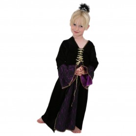 Perfect for Halloween this medieval style witches dress is an absolute bargain ! Not quite perfect , it may have a slight mark , fabric pull or sewing fault , but you will barely notice what the fault is ! with a main body of weighty velvet fabric , and edges of gold thread , the bell sleeves and centre panel are of purple satin topped with black lace detail . The bodice has pull to size gold ribbon fastening, criss crossing across the chest .Stunning quality and finished with a witches hat , this will be a fabulous halloween costume.