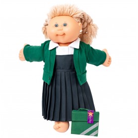 This school uniform includes a grey pinafore and white blouse, a purple cardigan , a purple bookbag and black patent Mary Jane style shoes for Luvabella dolls. Image shows green but listing is for purple cardigan and purple book bag.